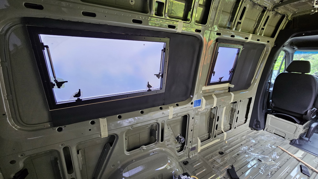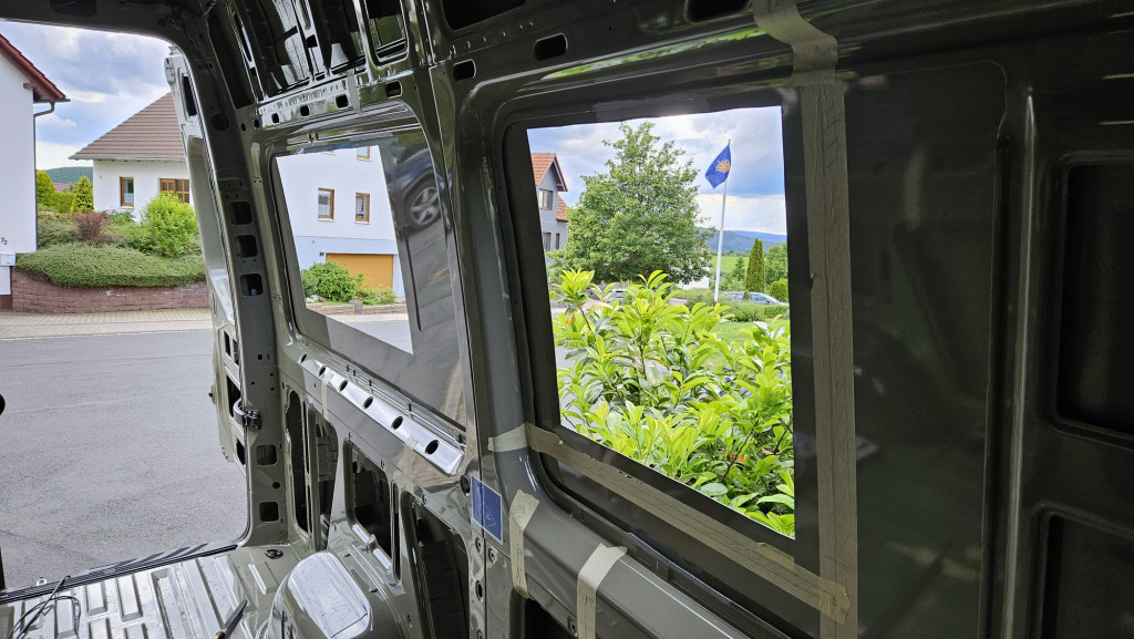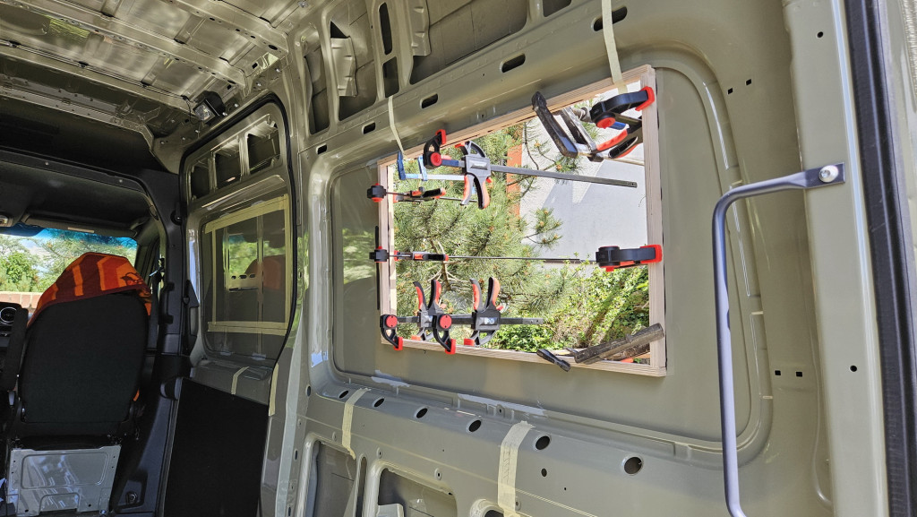 Eingebaut werden Fenster von Belluna. Obwohl der Sprinter keine geraden Flächen hat, kann man den notwendigen Holzrahmen mit Sikaflex oder K-Flex ankleben. Schraubzwingen helfen die Bleche entsprechend plan zu ziehen.