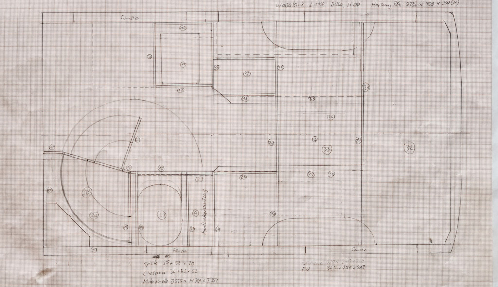 Das ist der geplante Grundriss, der Ausgangspunkt für den Möbelbau. Da im Sprinter alle Flächen krumm sind, ist das Arbeiten „am Objekt“ mit ständiger Maßnahme notwendig. Die Skizze ist nur Anhaltspunkt, konstruiert wird live.
