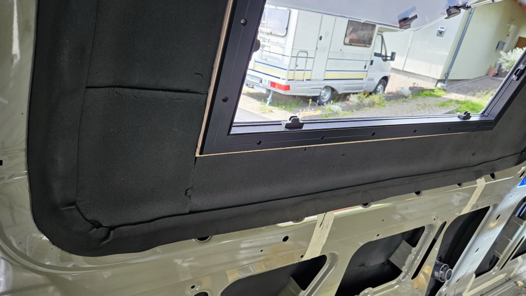 Hier sieht man nochmal, wie die Fenster an den Holzrahmen geschraubt sind. Darauf kommt noch der Innenrahmen mit Fliegengitter und Verdunklung. Die zweite Lage K-Flex kommt auch noch drauf, das ist dann bündig mit dem Rahmen.