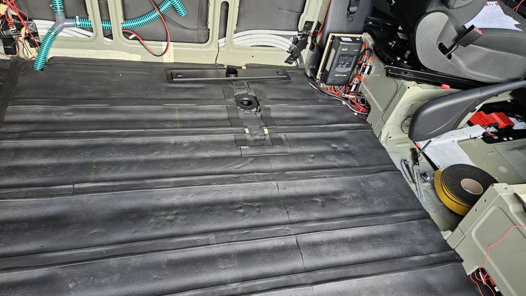 Vor der Montage der Bodenplatte muss auch noch die Elektrik verlegt werden. Zur Gewichtseinsparung ist die Bodenplatte auch unter den Schränken ausgespart. Die Leisten bekommen auch Dämmstreifen aufgeklebt, um knarzen zu vermeiden. Als Finish werden PVC-Fußbodenfliesen aufgeklebt.