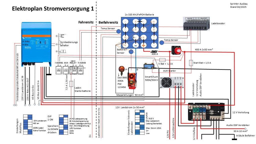 - Einbindung in die Fahrzeugelektrik, Winde und PV. PV ermöglicht auch eine wichtige Erhaltungsladung der Starterbatterie.