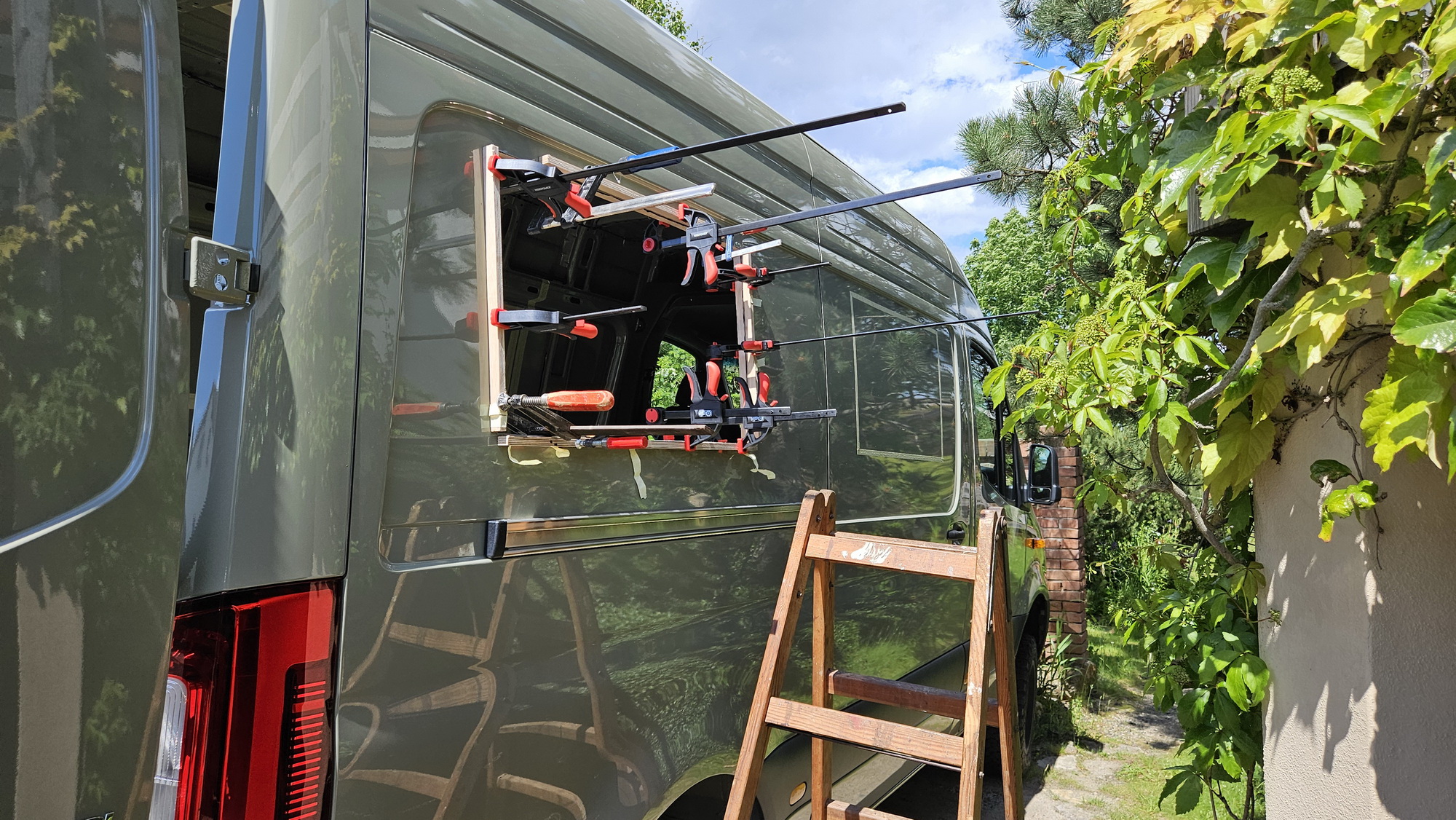 Eingebaut werden Fenster von Belluna. Obwohl der Sprinter keine geraden Flächen hat, kann man den notwendigen Holzrahmen mit Sikaflex oder K-Flex ankleben. Schraubzwingen helfen die Bleche entsprechend plan zu ziehen.