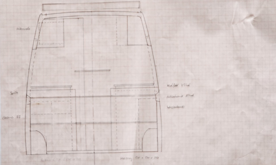 Das ist der geplante Grundriss, der Ausgangspunkt für den Möbelbau. Da im Sprinter alle Flächen krumm sind, ist das Arbeiten „am Objekt“ mit ständiger Maßnahme notwendig. Die Skizze ist nur Anhaltspunkt, konstruiert wird live.