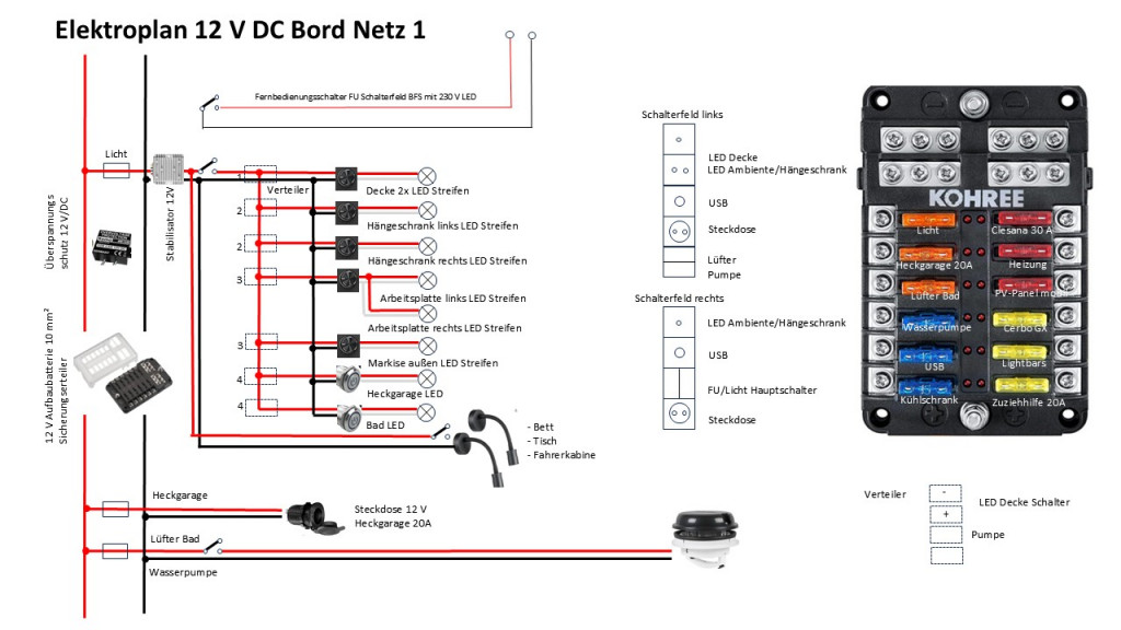 Die Elektrik ist für manche ein Horror. Zugegeben, das ist nicht ganz einfach, man muss sich hineindenken und viel recherchieren. Ganz wichtig ist eine genaue Dokumentation und ein Schaltplan, sonst blickt man später nicht mehr durch.
