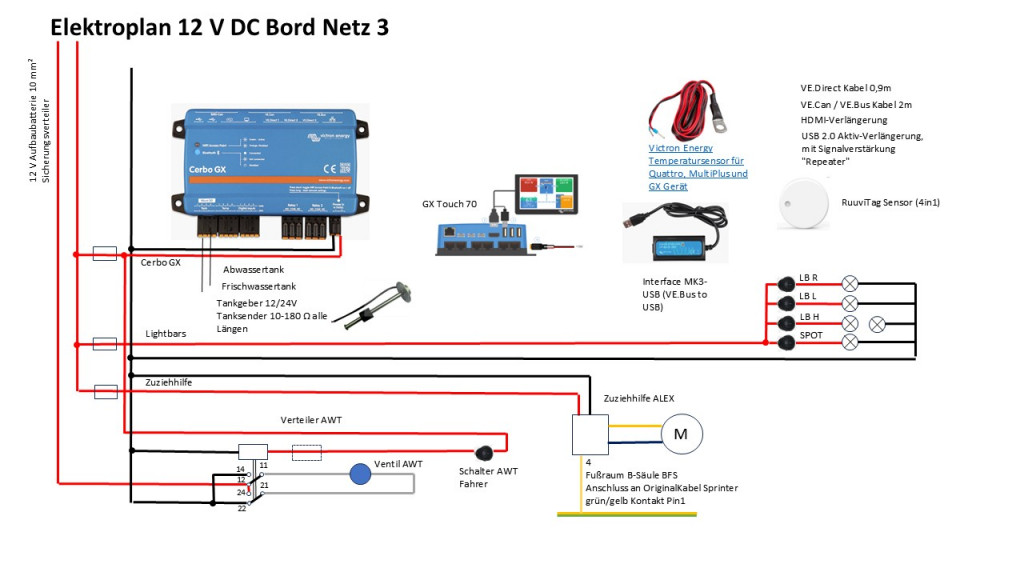- Einbindung in die Fahrzeugelektrik, Winde und PV. PV ermöglicht auch eine wichtige Erhaltungsladung der Starterbatterie.