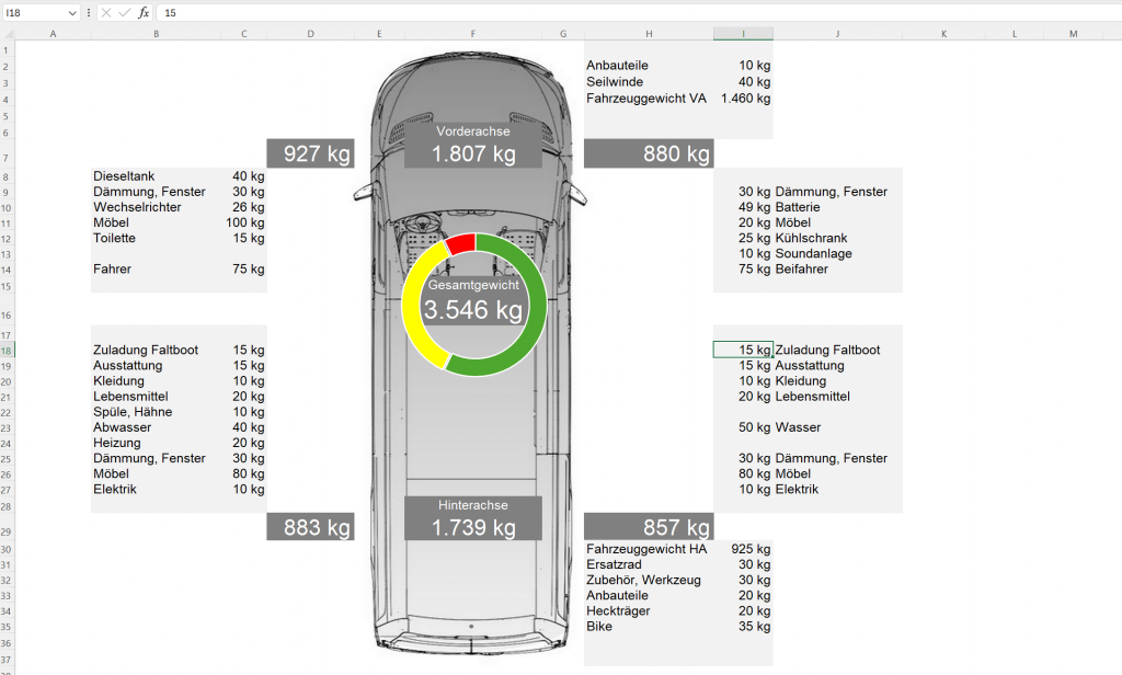 Wir liegen mit 2 Personen knapp unter 3,5t – eine Punktlandung. Jeder eingebaute Artikel ist einzeln aufgeführt. Ein Link führt direkt zu dem Shop, bei dem man es am preiswertesten bekommt. Preise und Verfügbarkeit werden sich sicher auch ändern. Dahinter ist die Stückzahl mit dem Preis aufgeführt und das Gewicht des Artikels. So ist eine recht genaue Massenvorberechnung möglich. Die Waage hat nach Fertigstellung auch gezeigt, dass es ganz gut passt.