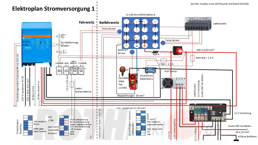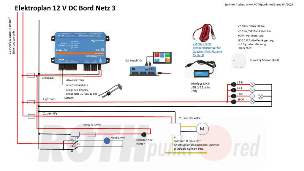 - Einbindung in die Fahrzeugelektrik, Winde und PV. PV ermöglicht auch eine wichtige Erhaltungsladung der Starterbatterie.